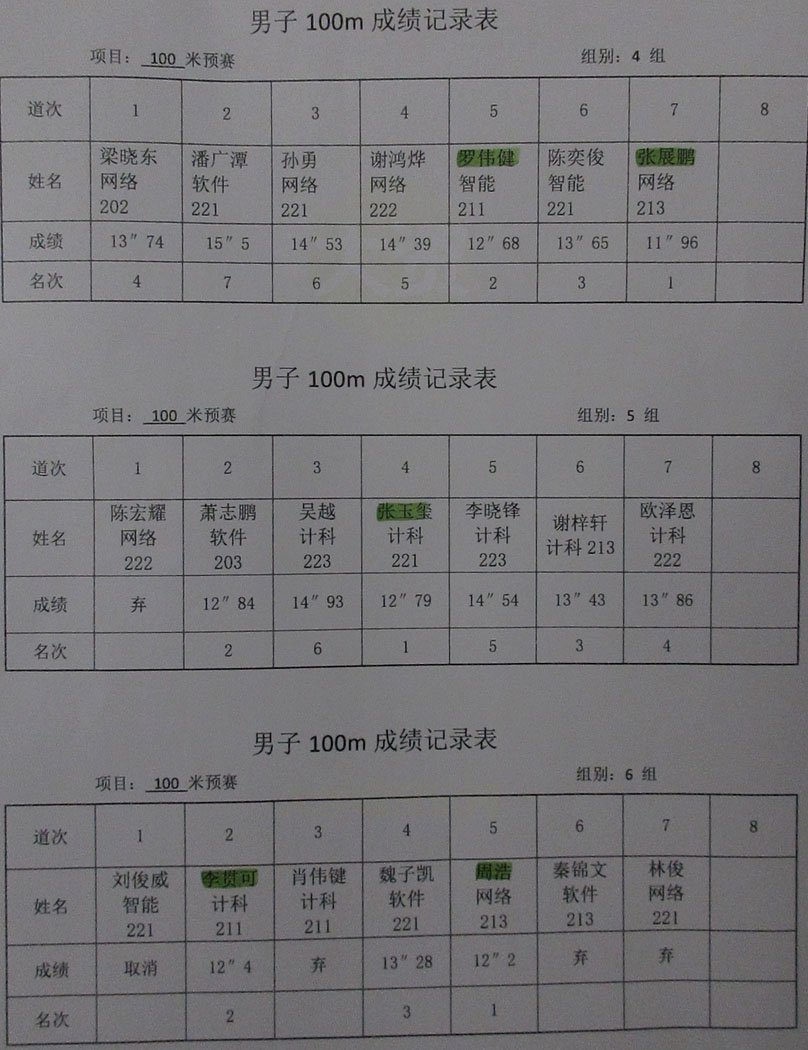 晋级下午100米决赛的名单及用时: 邓迪 12秒8 汉语202 预赛第四 姚俊豪 12秒34 网安211 预赛第五 程威 12秒54 软件222 预赛第六 罗伟健 12秒68 智能211 预赛第七 张展鹏 11秒96 网络213 预赛第一 张玉玺 12秒79 计科221 预赛第八 李贯可 12秒4 计科211 预赛第三 周浩 12秒2 网络213 预赛第二 |