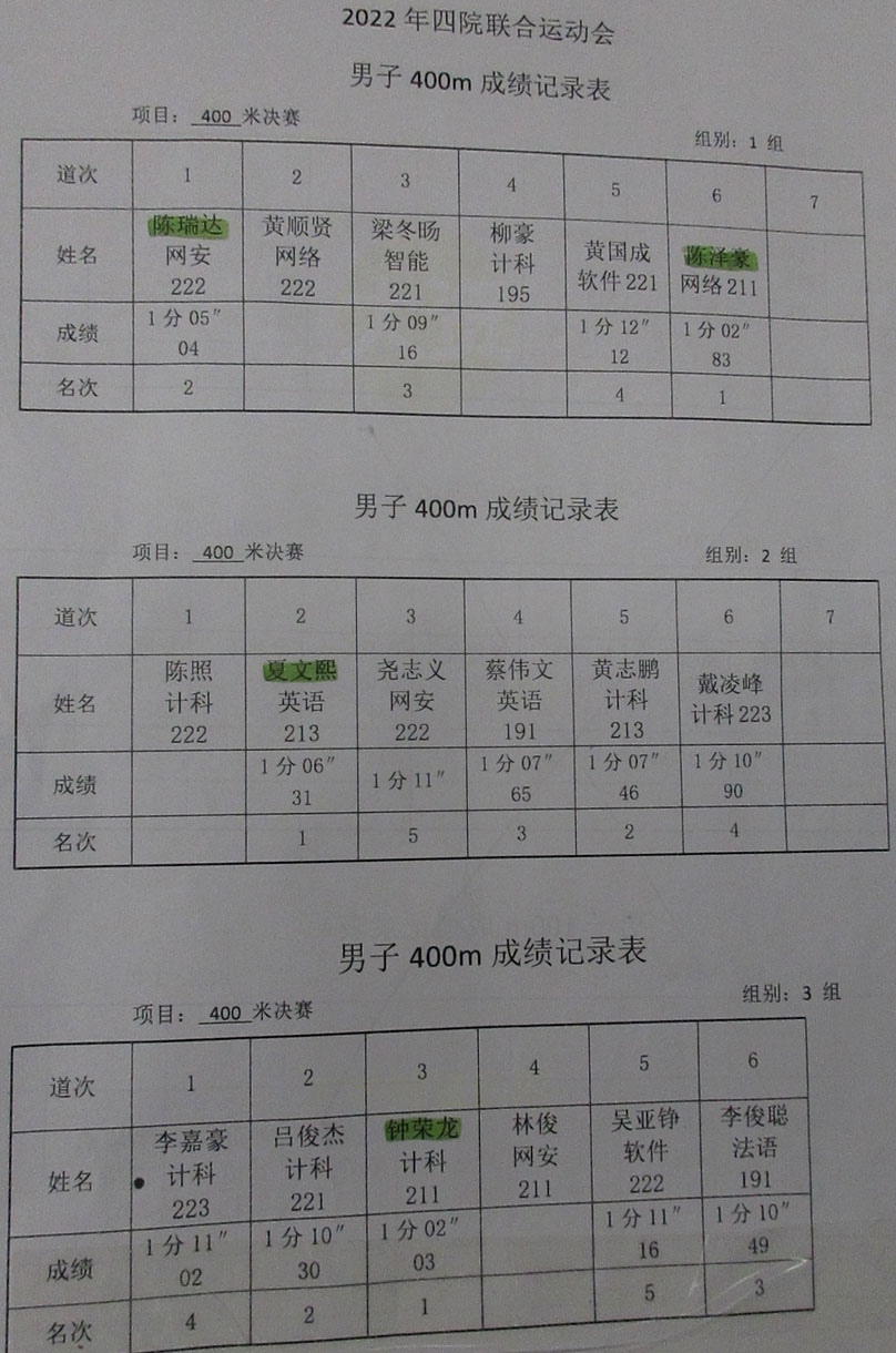 2022.10.22广大四院联合运动会 男子400米预决赛(3组)成绩记录表