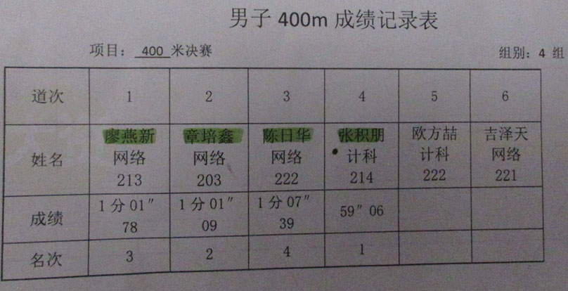 男子400米最终成绩前八名为: 陈瑞达 1分05秒04 网安222 400米决赛第六 陈泽豪 1分02秒83 网络211 400米决赛第五 夏文熙 1分06秒31 英语213 400米决赛第七 钟荣龙 1分02秒03 计科211 400米决赛第四 廖燕新 1分01秒78 网络213 400米决赛第三 章培鑫 1分01秒09 网络203 400米决赛第二 陈日华 1分07秒39 网络222 400米决赛第八 张积朋 59秒06 计科214 400米决赛第一 |