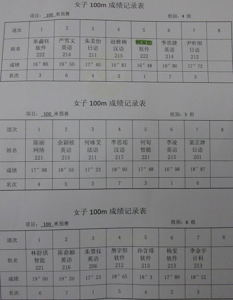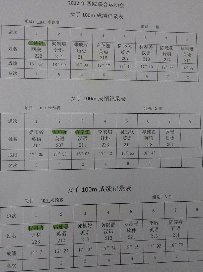 2022.10.22广大四院联合运动会 女子100米预赛(7个小组)成绩记录表