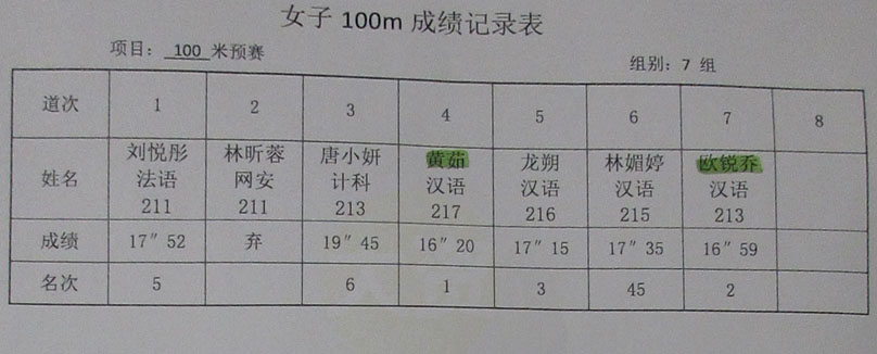 2022.10.22广大四院联合运动会 女子100米预赛(7个小组)成绩记录表 晋级决赛的名单如下: 王诗语 16秒67 网安222 周巧婵 15秒53 英语207 许幸璇 16秒03 汉语211 程冉冉 14秒70 计科223 雷珊珊 16秒24 英语212 何家怡 16秒48 软件222 黄茹 16秒20 汉语217 欧锐乔 16秒59 汉语213 |