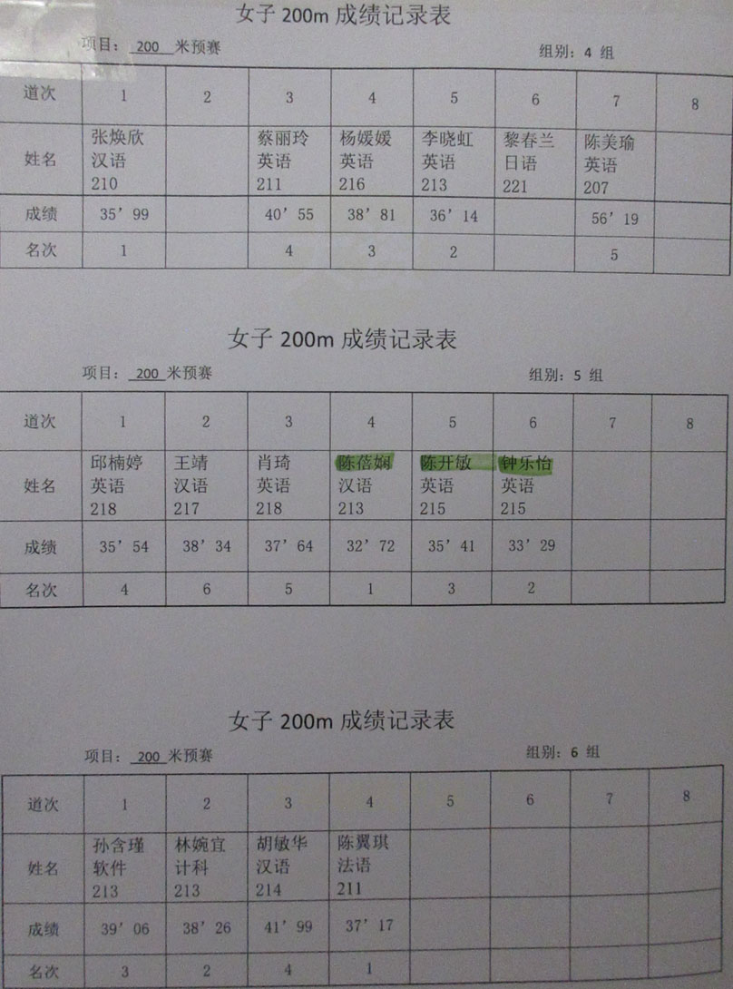 2022.10.22广大四院联合运动会 女子200米预赛(6组)成绩记录表 晋级女子200决赛名单如下: 吴文怡 35秒46 汉语214 江欢铌 32秒74 英语217 杨倩仪 34秒95 英语216 王诗语 35秒07 网安222 程冉冉 31秒91 计科223 陈蓓娴 32秒72 汉语213 陈开敏 35秒41 英语215 钟乐怡 33秒29 英语215 |
