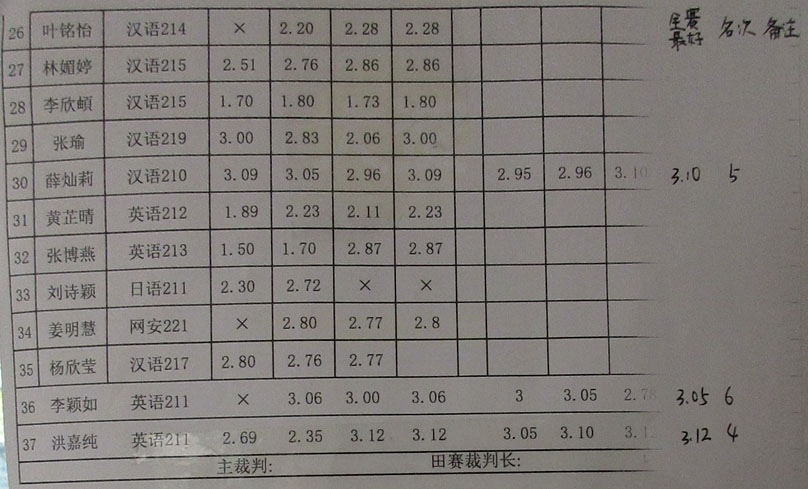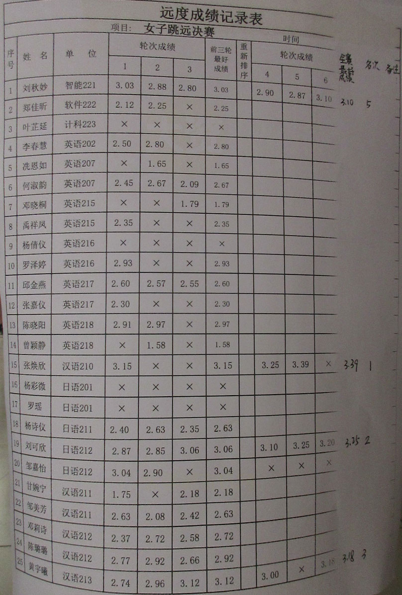 计算机、外国语、人文、网安四院联合运动会 女子跳决赛-远度成绩记录表 第一名:张焕欣 3米39 汉语210 第二名:刘可欣 3米25 日语212 第三名:黄宇曦 3米18 汉语213 第四名:洪嘉纯 3米12 英语211 第五名:刘秋妙 3米10 智能221 第五名:薛灿莉 3米10 汉语210 第六名:李颖如 3米05 英语211 |