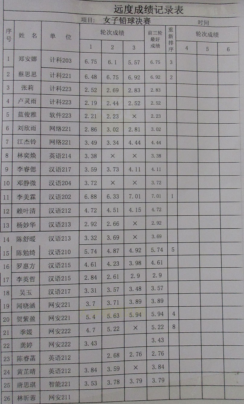 计算机、外国语、人文、网安四院联合运动会 女子铅球决赛-远度成绩记录表 第一名:李美霖 7米01 汉语202 第二名:蔡思思 6米92 计科221 第三名:郑安娜 6米75 计科203 第四名:贺紫盈 5米94 网安221 第五名:陈勉绮 5米74 汉语210 第六名:冼恩如 5米37 英语207 第七名:梁芷欣 5米28 日语201 第八名:季媛 5米22 网安222 |