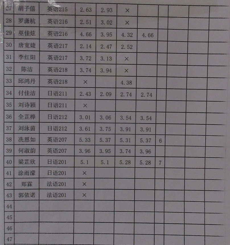 计算机、外国语、人文、网安四院联合运动会 女子铅球决赛-远度成绩记录表