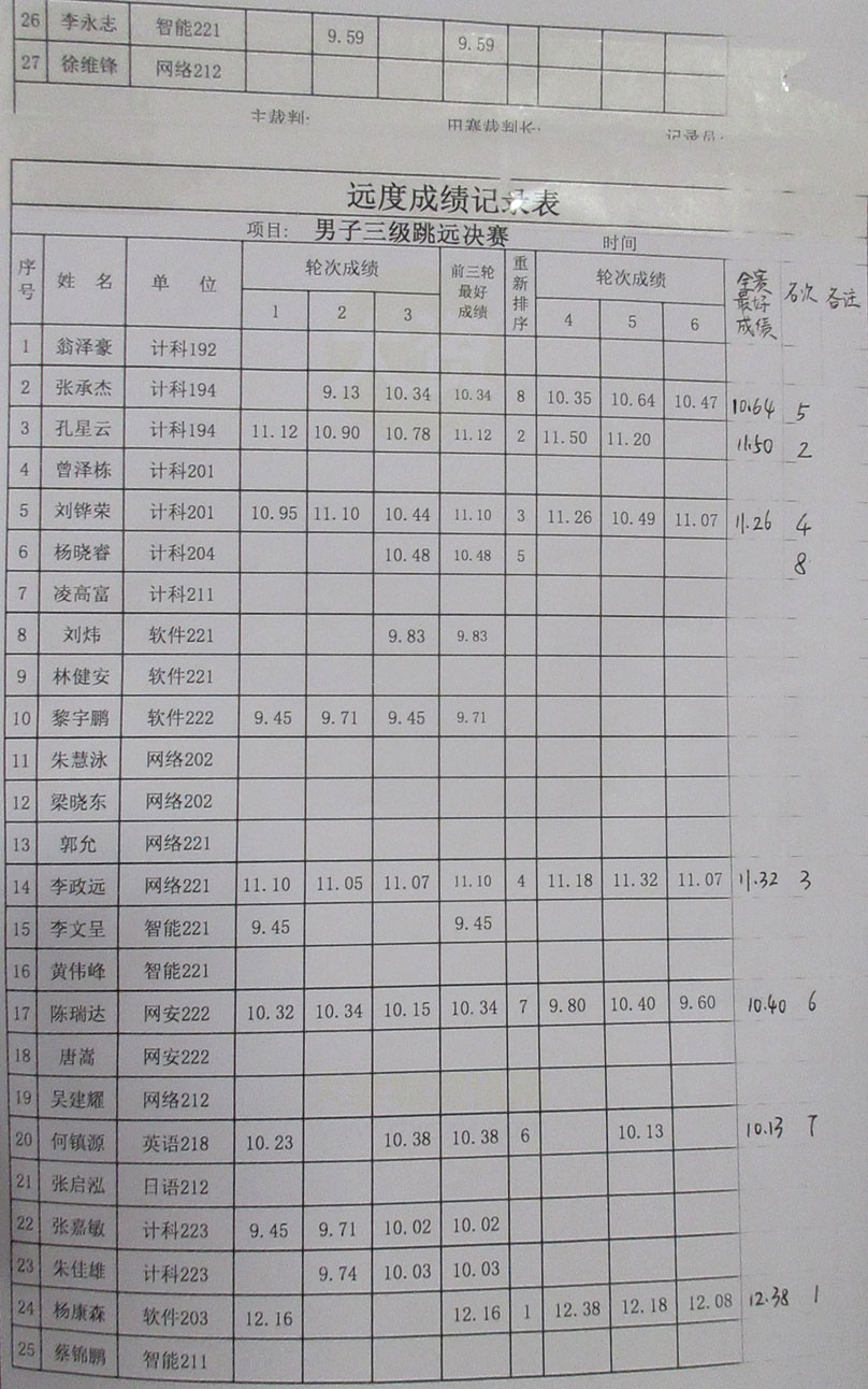 计算机、外国语、人文、网安四院联合运动会 男子三级跳远决赛-远度成绩记录表 第一名:杨康森 12米38 软件203 第二名:孔星云 11米50 计科194 第三名:李政远 11米32 网络221 第四名:刘铧荣 11米26 计科201 第五名:张承杰 10米64 计科194 第六名:陈瑞达 10米40 网安222 第七名:何镇源 10米13 英语218 第八名:杨晓睿 计科204 |