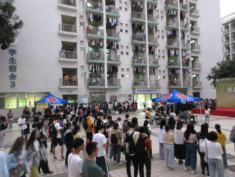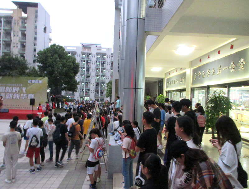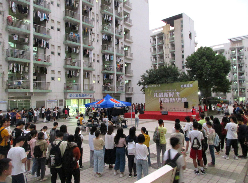 广中医生活区一饭前广场-校园歌手大赛初赛现场-众多参赛者踊跃试唱,引大批学生驻足观听