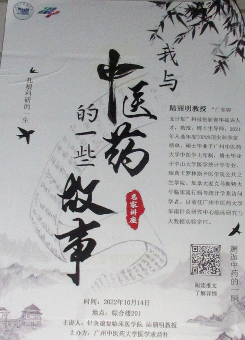 名家讲座 我与中医药的一些故事 2022年10月14日晚上19点开始 教学区综合楼201 陆丽明教授 扎根科研的一生 |