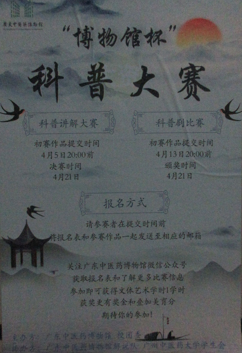 | 广中医博物馆杯科普大赛 科普讲解大赛初赛作品提交于4.5晚8点前 科普剧比赛初赛作品提交于4.13晚8点前 决赛&颁奖4月21日 | ||||||