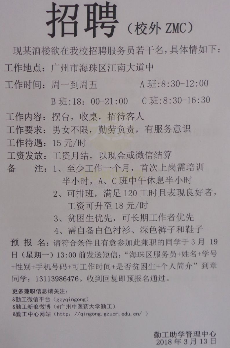 | [招聘]|(校外ZMC)现某酒楼欲在我校招聘服务员若干名 2018年3月13日 | ||||||