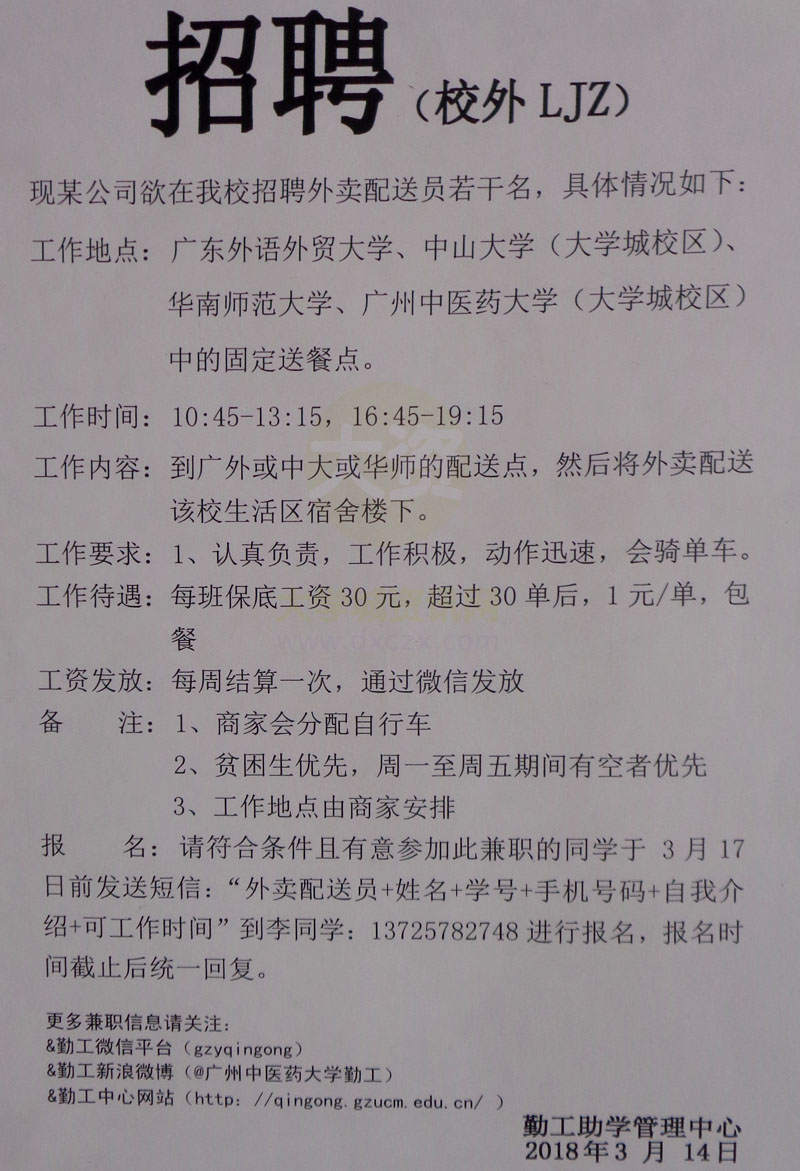 | [招聘] | (校外 LJZ) 现某公司欲在我校招聘外卖配送员若干名 2018年3月14日 | ||||||