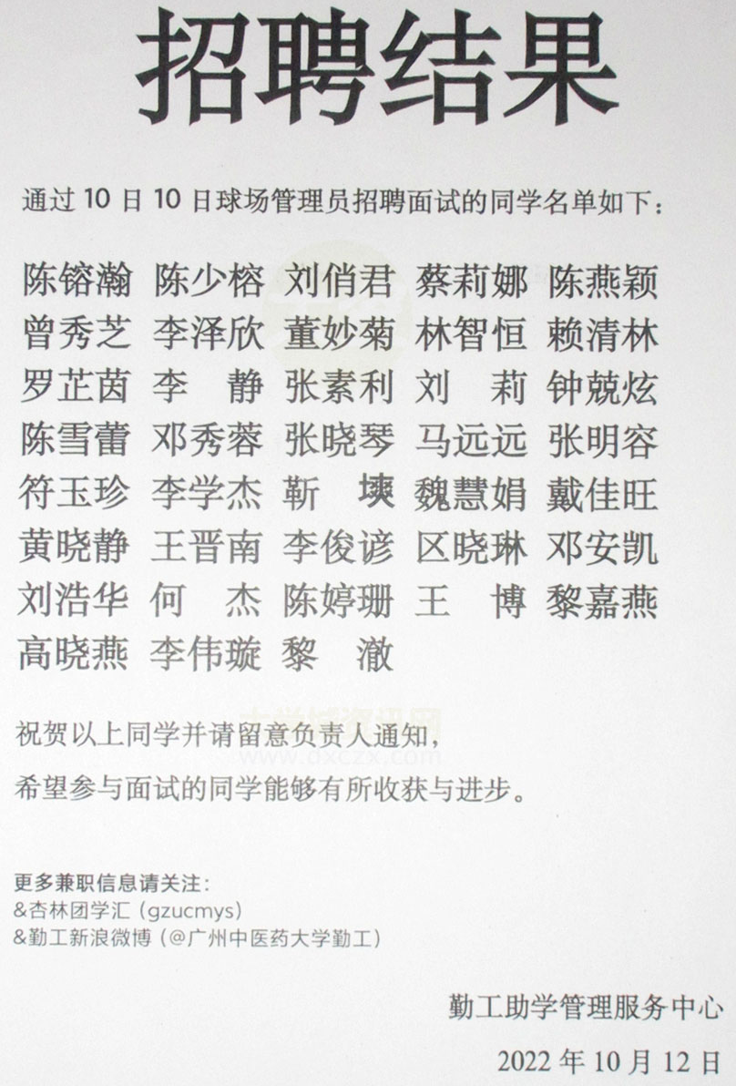 勤工讯息 [招聘结果] 公布 通过10月10日球场管理员招聘面试的同学名单 2022年10月12日 |