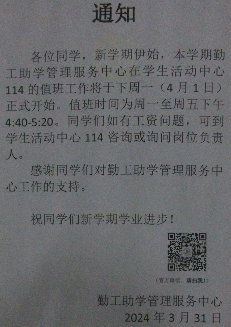 | 广中医-本学期勤工助学管理服务中心在学生活动中心114的值班工作将于下周一4.1正式开始 具体为周一至周五下午4.40-5.20 | ||||||