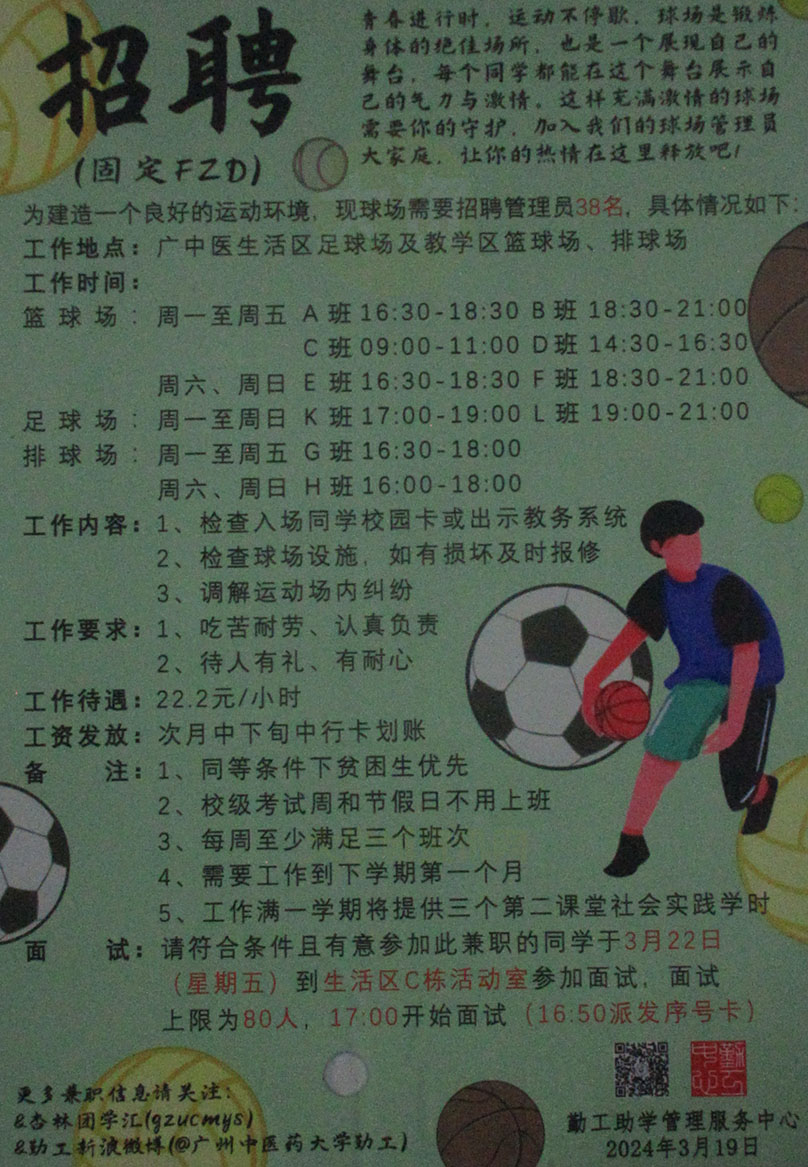 | 广中医-勤工-[招聘] | (固定FZD) 广中医生活区足球场及教学区篮球场,排球场招聘管理员38名 勤工2024.03.19 | ||||||