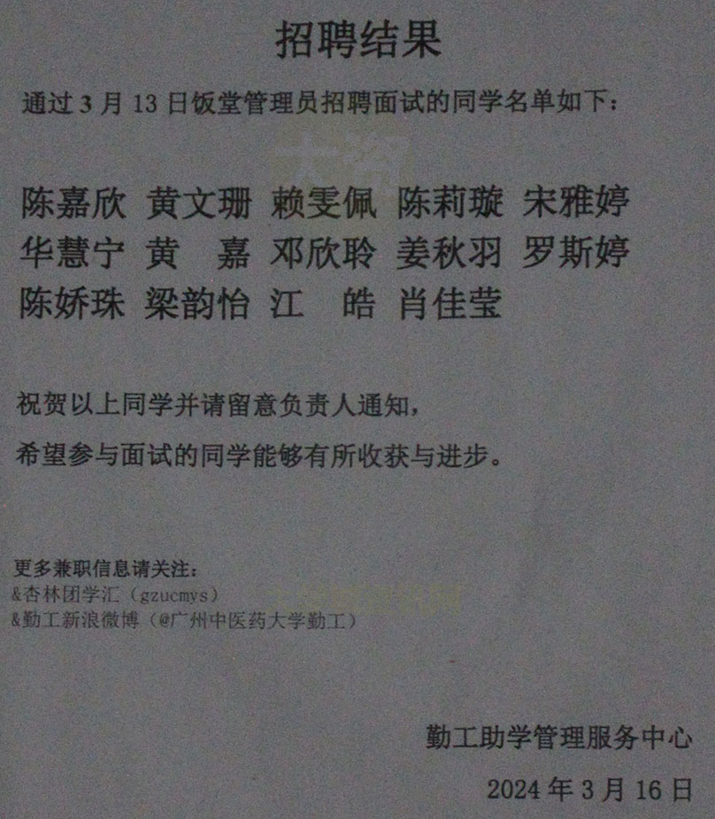 | 广中医-勤工-[招聘结果] 通过3月13日饭堂管理员招聘面试的同学名单 陈嘉欣 黄文珊 ... 勤工2024.03.16 | ||||||