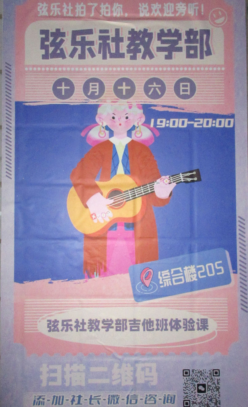 | 广中医弦乐社教学部 吉他班体验课 10月16日晚19点-20点 教学区综合楼205 扫码二维码添加社长微信咨询 | ||||||