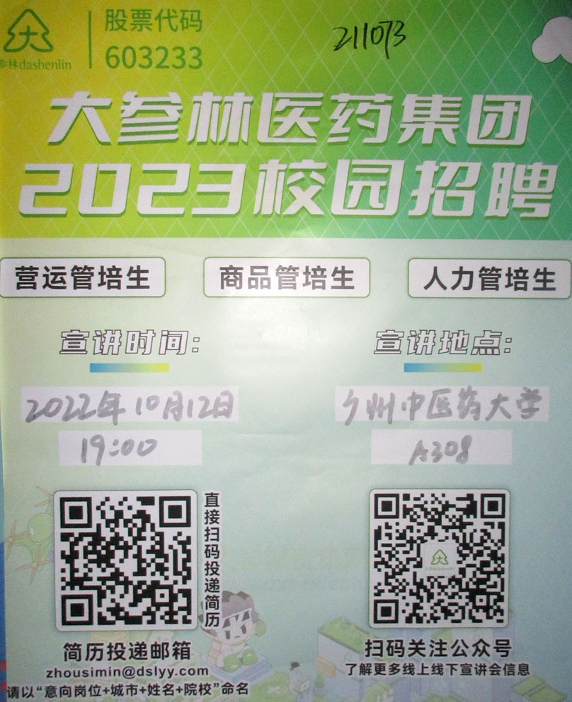 大参林医药集团2023校园招聘 2022.10.12周三晚19点 教学区A308 职位-营运,商品,人力管培生 |