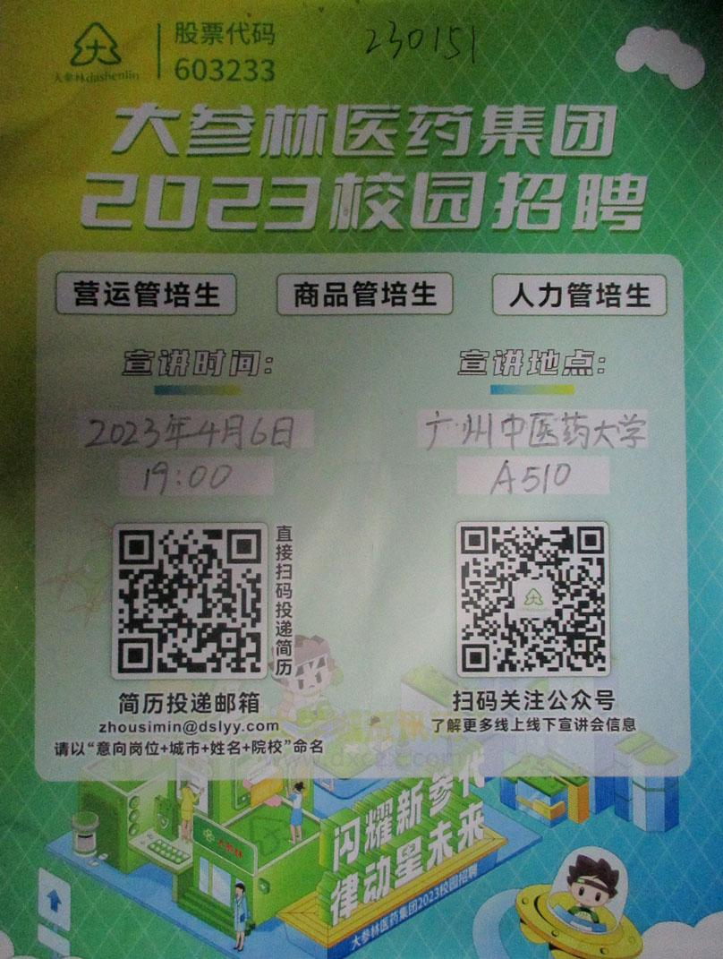 大参林医药集团2023校园招聘宣讲会 2023年4月6日晚19点 教学区A栋510 营运&商品&人力管培生 |