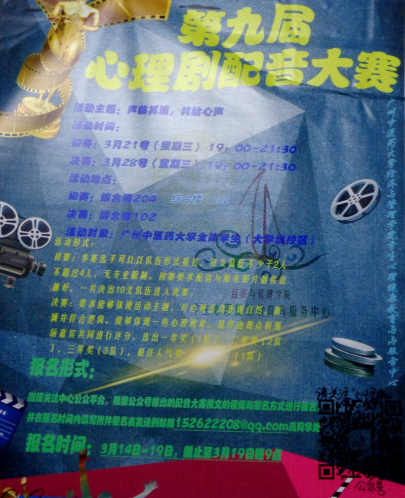 | 广中医经管院心理健康教育服务中心第九届心理剧配音大赛 报名时间:3月14日-19日 截止3月19日晚 | ||||||