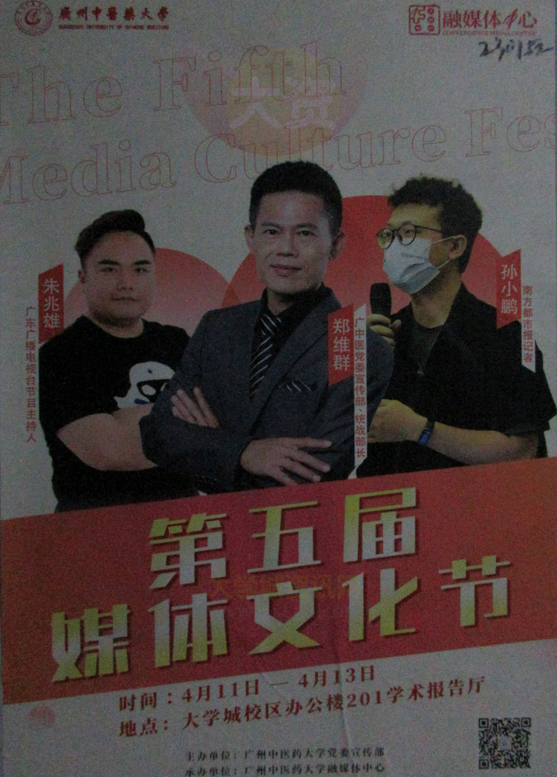 | 广中医第五届媒体文化节 4月11日-4月13日 教学区办公楼201学术报告厅 | ||||||