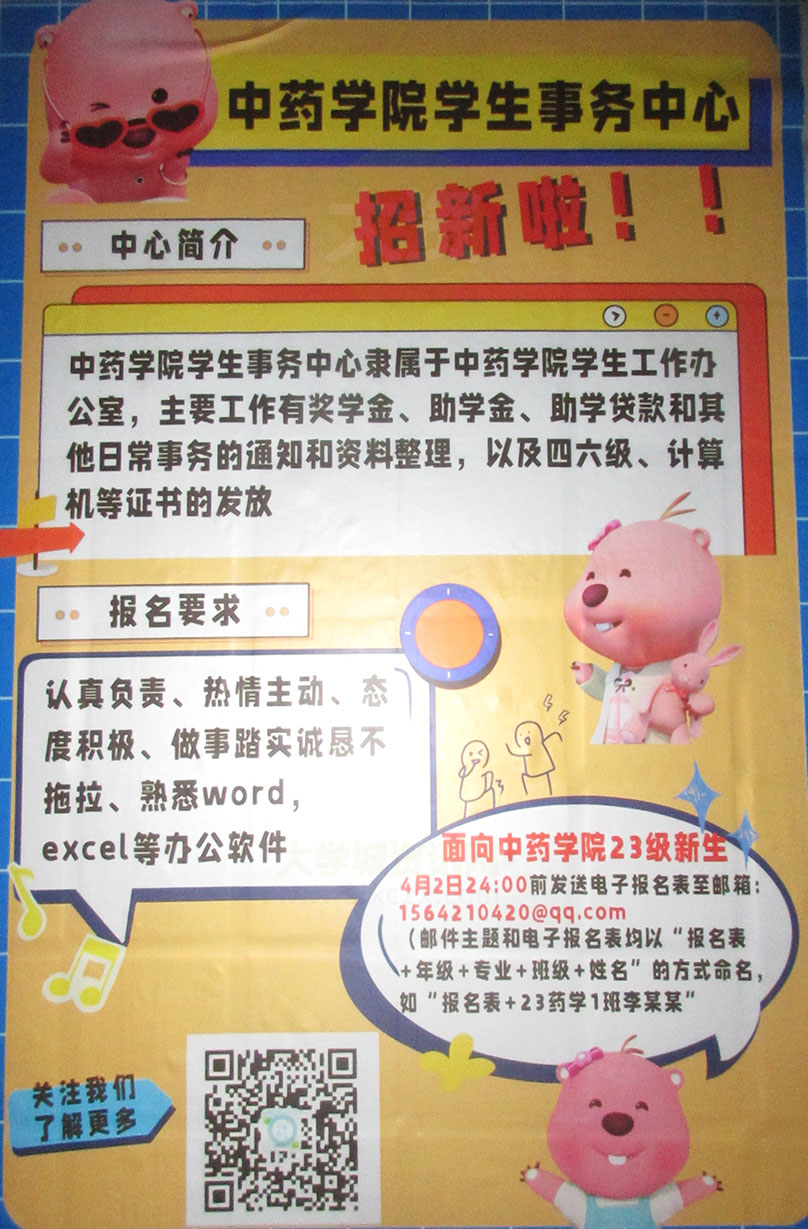 广中医-中药学院学生事务中心招新 面向中药学院23级新生 4月3号前发送电子报名表 |
