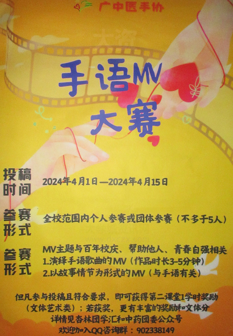 | 广中医-手语协会-手语MV大赛 2024.04.01-04.15 面向全校,团体个人皆可 了解详情入咨询群 获奖者有奖励and文体分 | ||||||