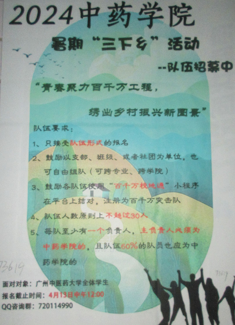 | 广中医-2024中药学院-暑期三下乡活动队伍招募中 面向全校学生 报名截止4.13中午12点 详情加QQ咨询群 | ||||||