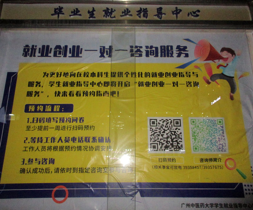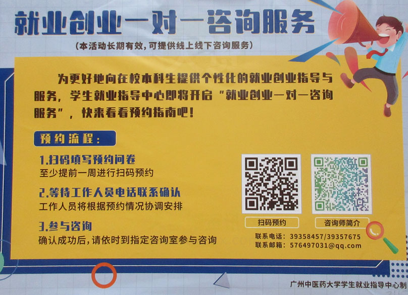 | 广中医毕业生就业指导中心-就业创业一对一咨询服务 预约流程:扫码预约,等待联系,参与咨询 | ||||||