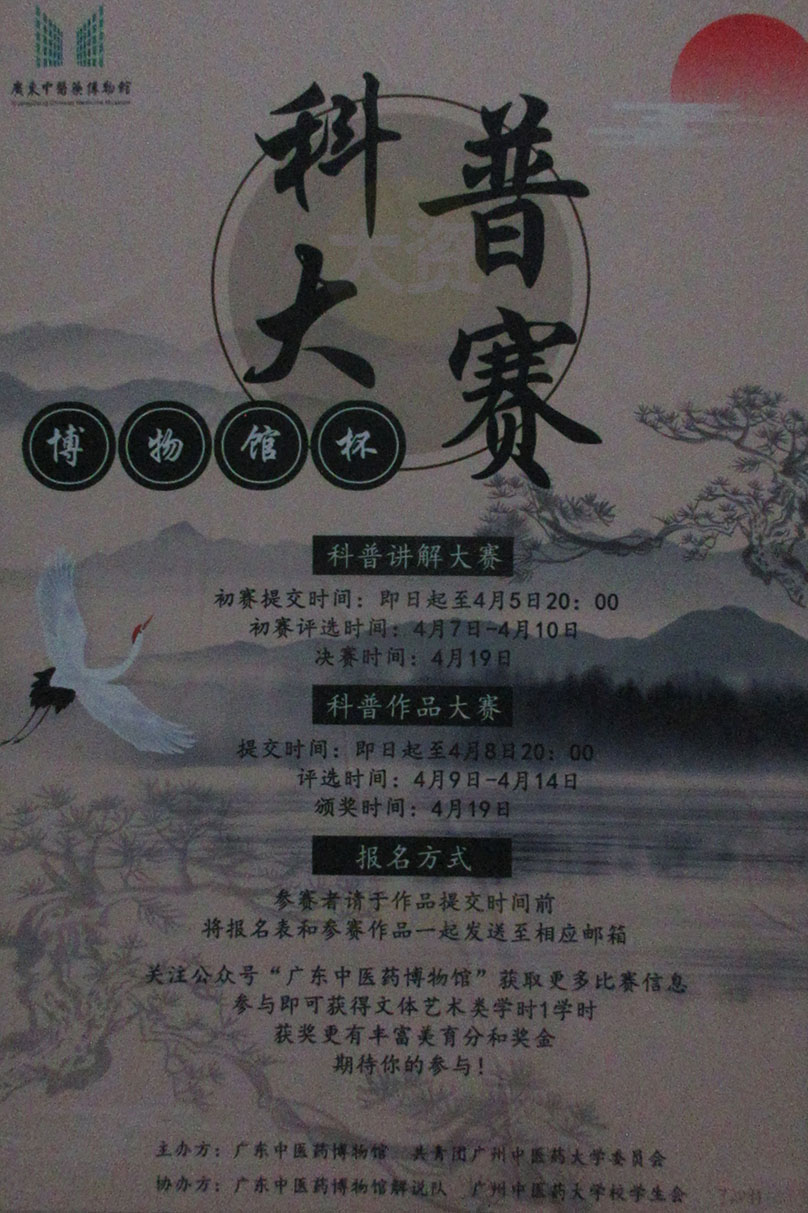 广中医-博物馆杯-科普大赛 讲解类-初赛提交截止4.5晚20点 时间4.7-4.10 决赛4.19 作品类-提交截止4.8晚20点 评选时间4.9-4.14 颁奖4.19 参赛可获学时 获奖还有美育分和奖金 |