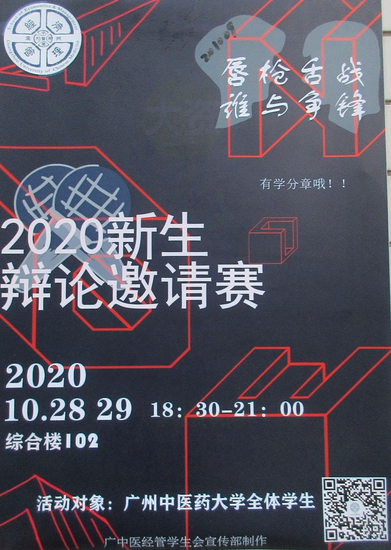 | 2020新生辩论邀请赛 2020.10.28/29 18:30-21:00 综合楼102 活动对象全体广中医学生 | ||||||