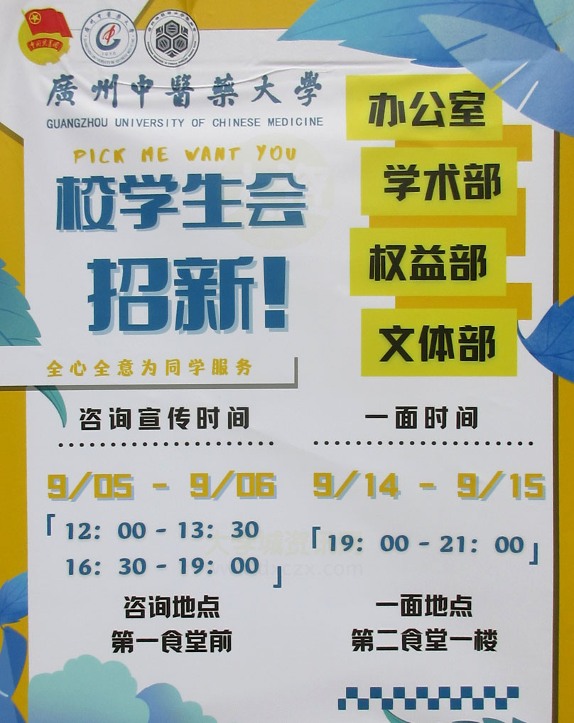 广中医校学生会招新(办公室,学术部,权益部,文体部) 咨询宣传时间9.5-9.6一饭前 一面时间9.14-9.15二饭一楼 |