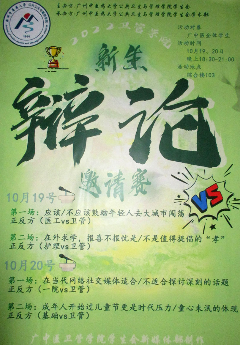 | 2022卫管学院 新生辩论邀请赛 面向全体广中医学院 10月19、20日晚18点30分-21点 教学区综合楼103 | ||||||