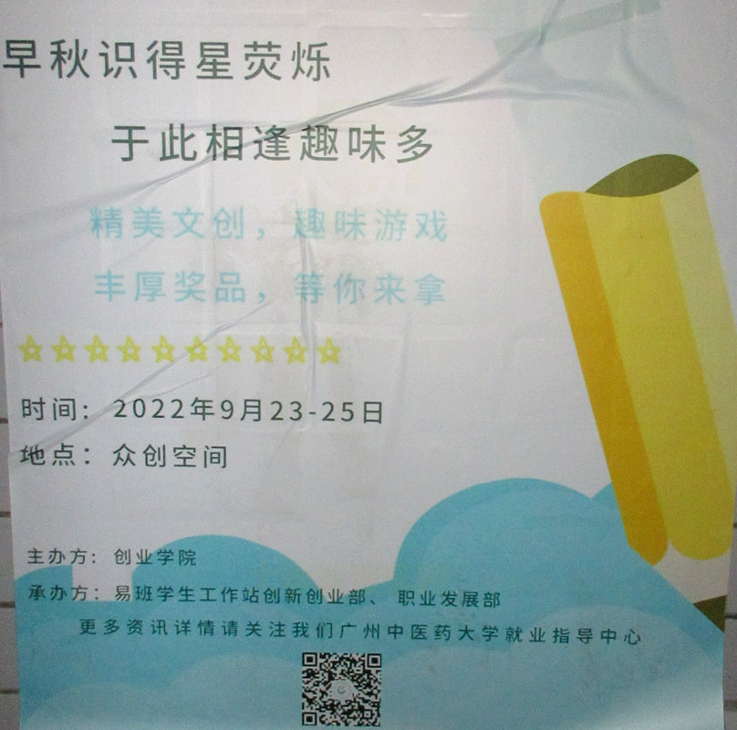 | 早秋识得星荧烁 于此相逢趣味多 精美文创,趣味游戏,丰厚奖品,等你来拿 2022.09.23-25 生活区众创空间 | ||||||