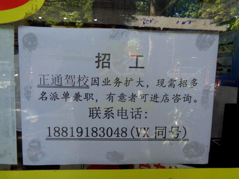 贝岗正通驾校因业务扩大,现需招多名派单兼职,有意者进店咨询。联系电话:18819183048(微信同号)
