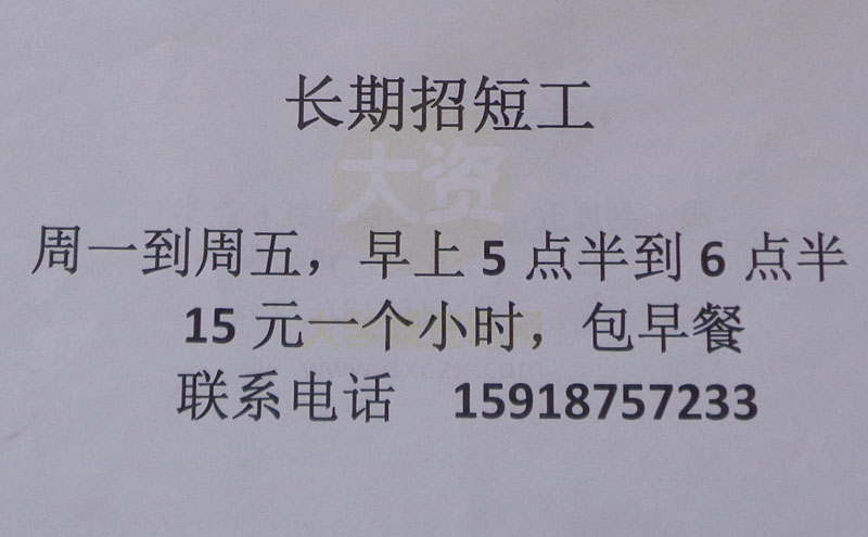 长期招短工 周一至周五早上5点半到6点半 15元/小时,包早餐