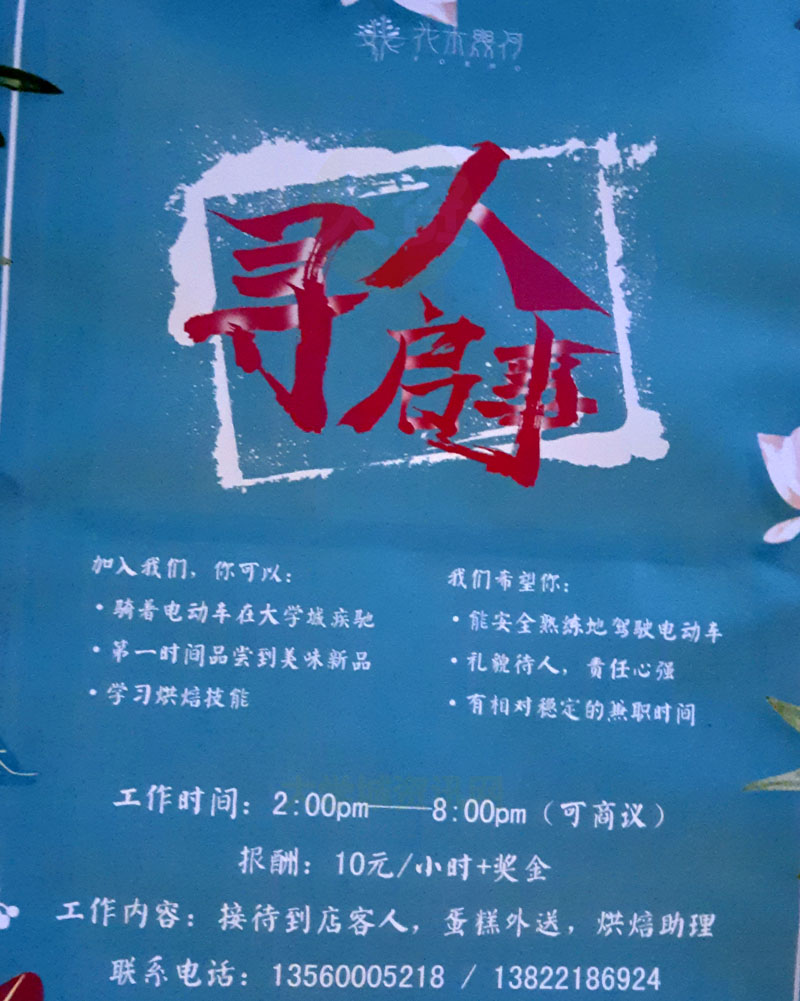 南亭村西社大街-花木几何烘焙店招聘兼职(骑手/接待/助理) 报酬:10元/小时+奖金