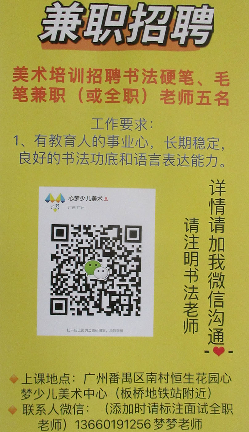 兼职招聘·美术培训招聘书法硬笔、毛笔兼职(或全职)老师五名 上课地点:番禺南村恒生花园心梦少儿美术中心