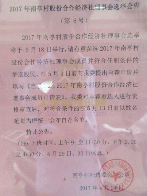 | 2017年南亭村股份合作经济社理事会选举公告(第6号) | ||||||
