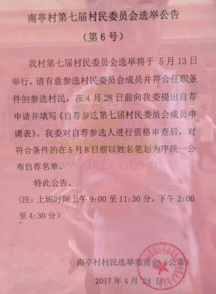 | 南亭村第七届村民委员会选举公告(第6号) | ||||||