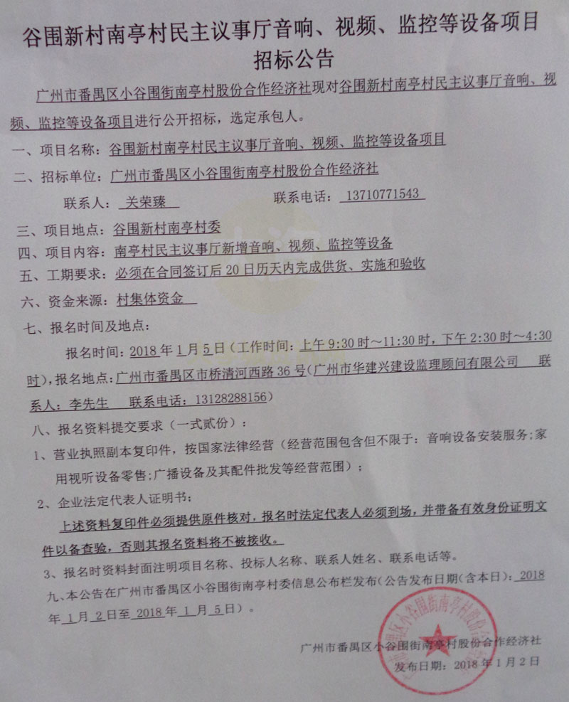 | 谷围新村南亭村民主议事厅音响、视频、监控等设备项目招标公告 | ||||||