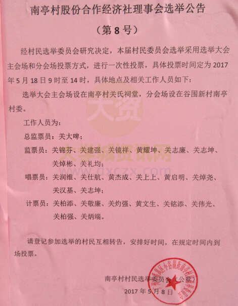 | 南亭村股份合作经济社理事会选举公告(第8号) | ||||||