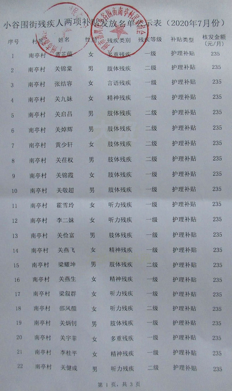 | 残疾人补贴名单公示-南亭村2020年7月份 | ||||||