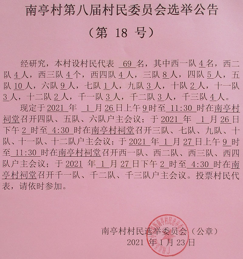 | 南亭村第八届村民委员会第18号选举公告-投票村民代表-通知 | ||||||