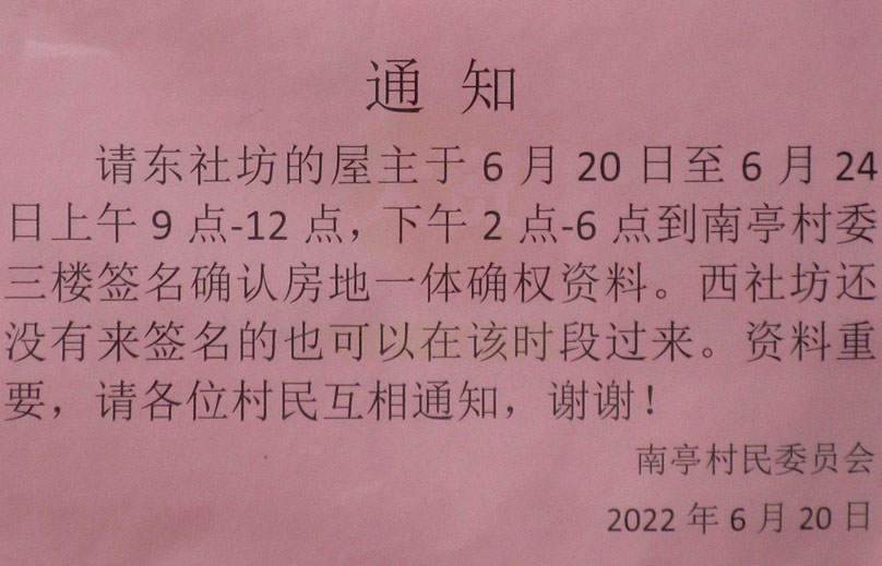南亭村委:东社坊屋主到村委三楼签名确认房地一体确权资料通知(附西社坊还未签名的也可前来) |