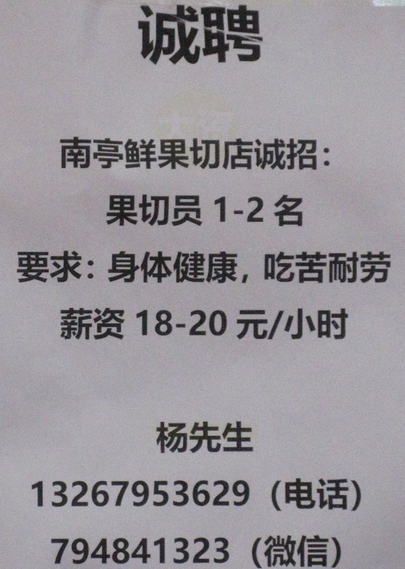 | 南亭鲜果切店诚聘果切员1-2名 薪资18-20元1小时 杨生13267953629 | ||||||