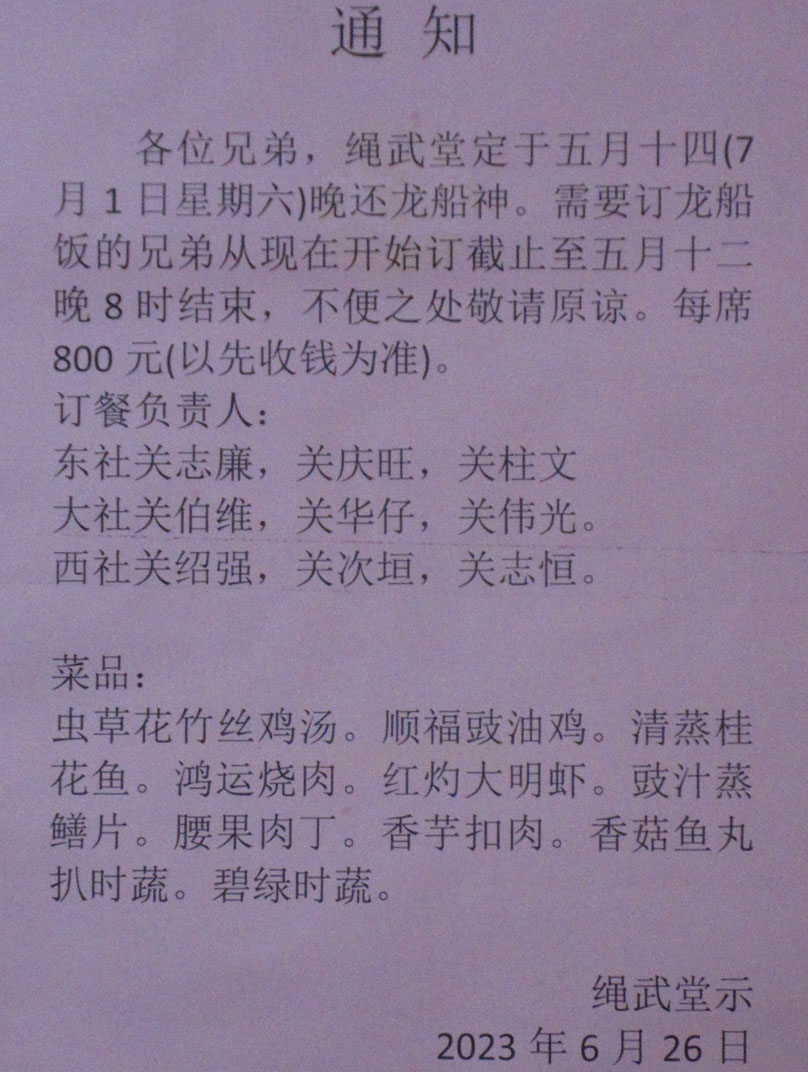 | 南亭村·绳武堂 还龙船神预订龙船饭通知 饭时7月1号(五月十四)晚 预订截止6月29号晚8点 | ||||||