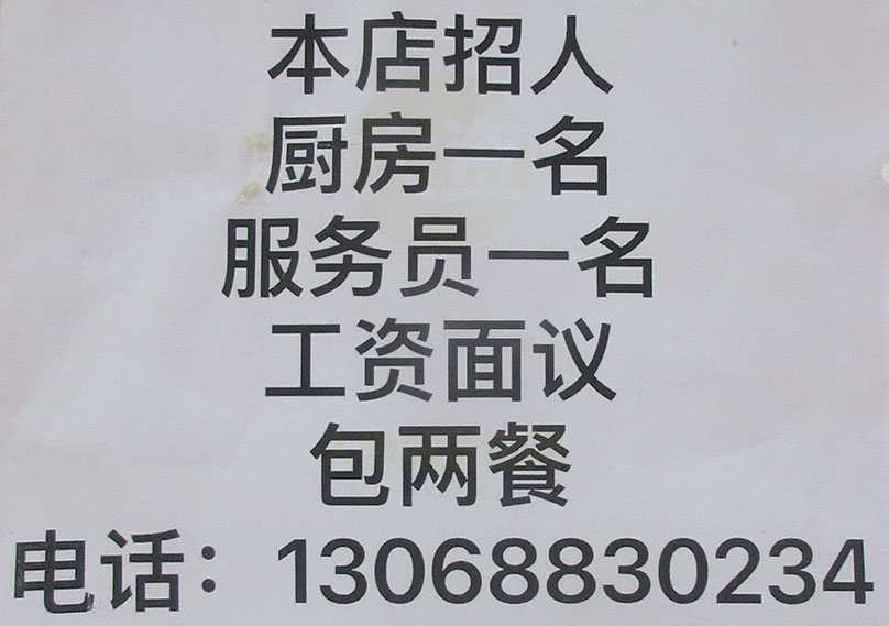 | 南亭-某餐饮店招厨房一名 服务员一名 工资面议 包两餐 电话13068830234 | ||||||