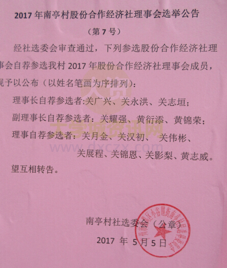 | 2017年南亭村股份合作经济社理事会选举公告(第7号) | ||||||