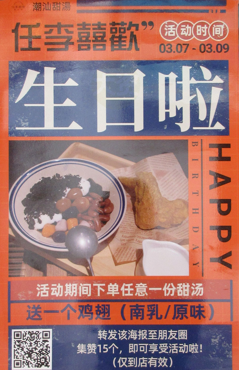 西社大街中 任李喜欢&潮汕手工甜汤 3.7-3.9期间下单任意一份甜汤送一个鸡翅 该活动发圈集赞可参与 仅限到店有效
