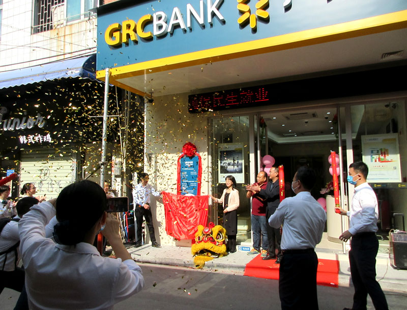 现场南亭村党委书记和江对面农商行华南新城支行书记行长一同为新网点揭牌